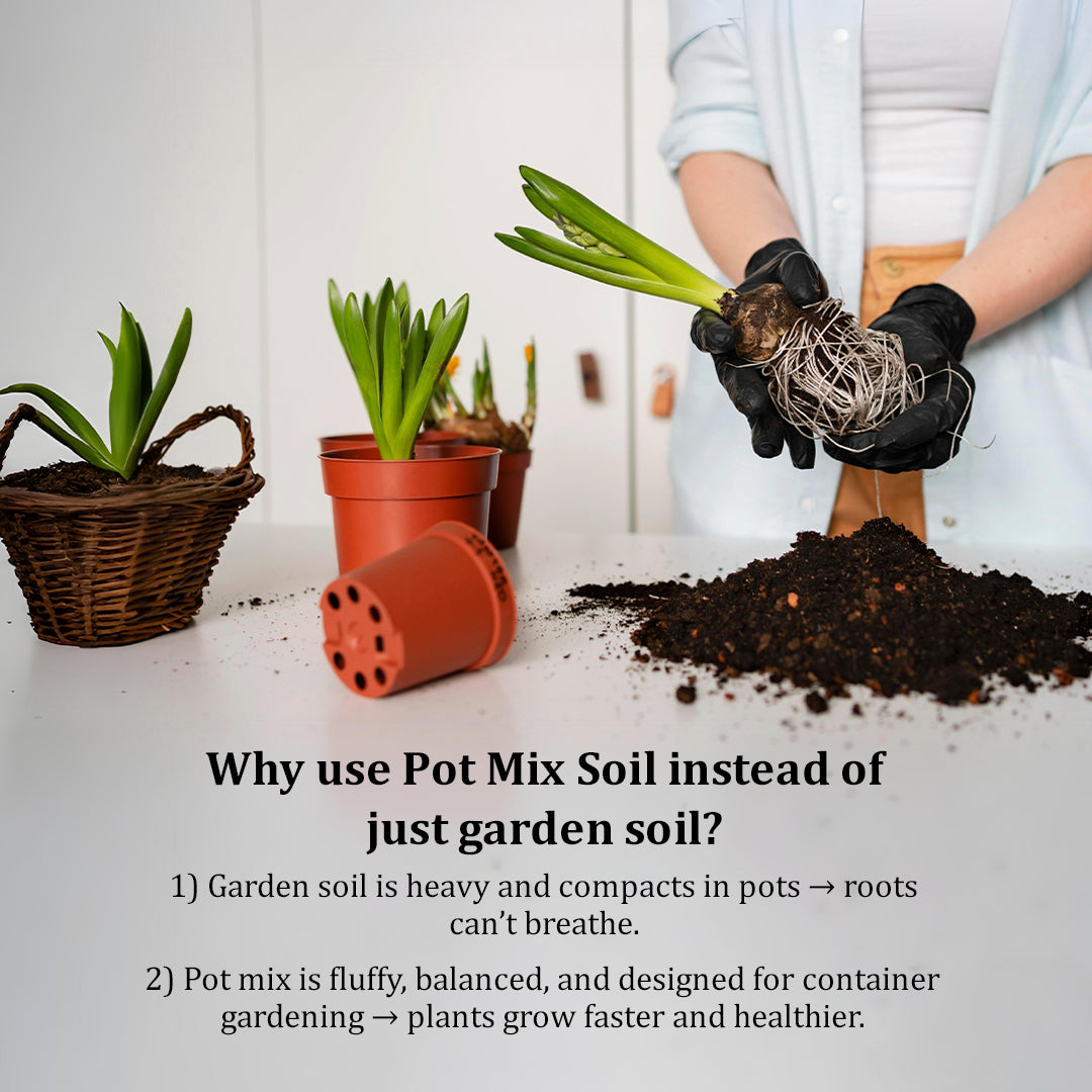 - लाभ: एक गुणवत्तायुक्त पॉटिंग मिश्रण नाइट्रोजन, फास्फोरस, पोटेशियम, कैल्शियम, मैग्नीशियम और ट्रेस खनिजों जैसे आवश्यक पोषक तत्वों के साथ पौधों की वृद्धि को बढ़ावा देता है, जिससे आदर्श जड़ विकास और स्वस्थ पौधों के लिए मिट्टी में वायु संचार और नमी प्रतिधारण में वृद्धि होती है।